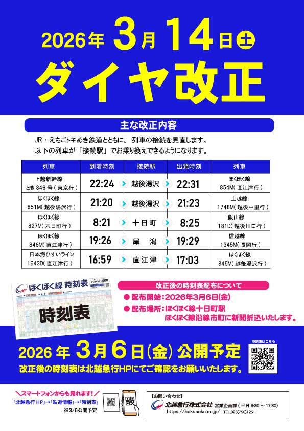 3月14日(土)からの新しい時刻表は、沿線の新聞折込およびほくほく線ホームページ(3月6日(金)~)に掲載いたします。