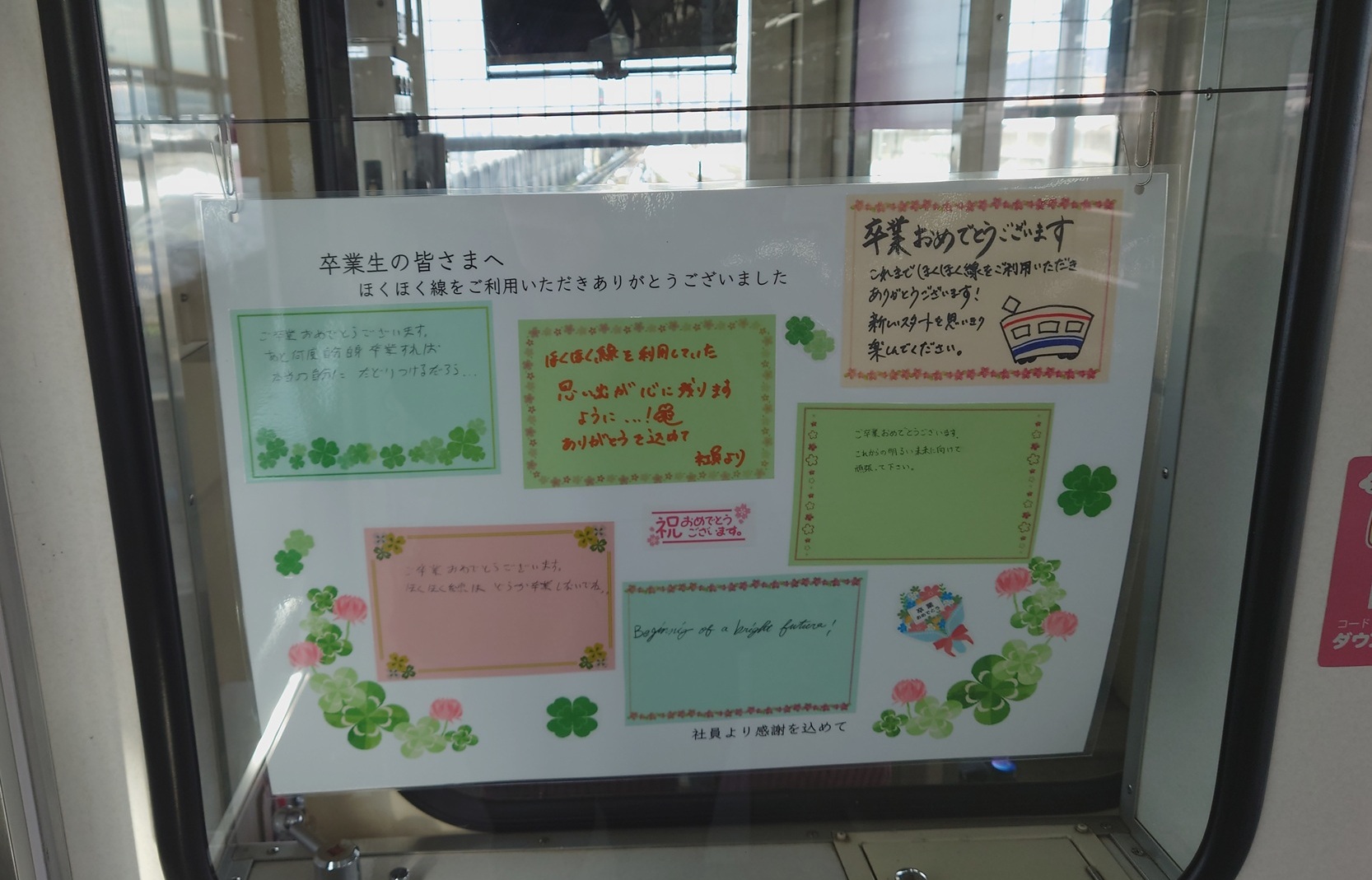卒業生の皆さまへ 投稿日時: 2026年2月25日 投稿者: ensen ほくほく線を利用してくれた卒業生の皆さまへ、 社員からの感謝と激励の気持ちを込めたメッセージを 車内へ掲出しています 残りわずかな電車での通学の際にご覧いただけたら嬉しいです 暑すぎる夏の日も、一面真っ白な大雪の日も、 ほくほく線をご利用いただきありがとうございました 皆さまの未来が明るいものとなりますように メッセージ掲出箇所:各車両 運転席背面(六日町方) 掲出期間:3月2日(月)まで