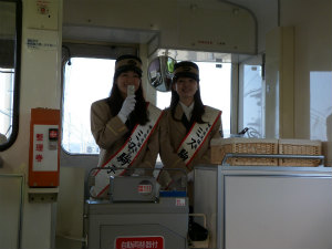 本日(3月22日)で「ほくほく線」は開業して16年目を迎えることができました。16年目を迎えられたのは日頃ほくほく線をご利用いただいている皆様のおかげです。そこで本日は日頃ほくほく線をご利用いただいている皆様に感謝の気持ちを込め、普通電車内で沿線のお菓子をプレゼントさせていただきました。写真はご協力いただきました第51代ミス駒子の金川さんと若井さんです。