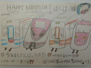 《バースデーカード》 投稿日時: 2013年3月27日 投稿者: ensen 先日、沿線の方からほくほく線の誕生日カードをいただきました ほくほく線の車両たちが勢ぞろいしていますが こうしてみるとまるで兄弟、家族のようですね すてきな絵をありがとうございました
