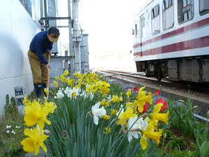 やっと雪が消えたので各駅に設置する花のプランターをみんなで作りました