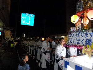 7月18日(木)に南魚沼市で開催された兼続公まつり「お六流し」に参加をしました。民謡流しが行われる直前まで雨が降っていましたが、中盤には雨も上がり最後まで踊ることができました。写真に写っている山車は「北越急行」のプラカードで、南魚沼市長賞をいただきました。