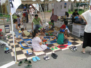 グッズ販売横の鉄道おもちゃで遊ぼうのコーナーにはたくさんの子供たちがみんな仲良く遊んでいってくれました