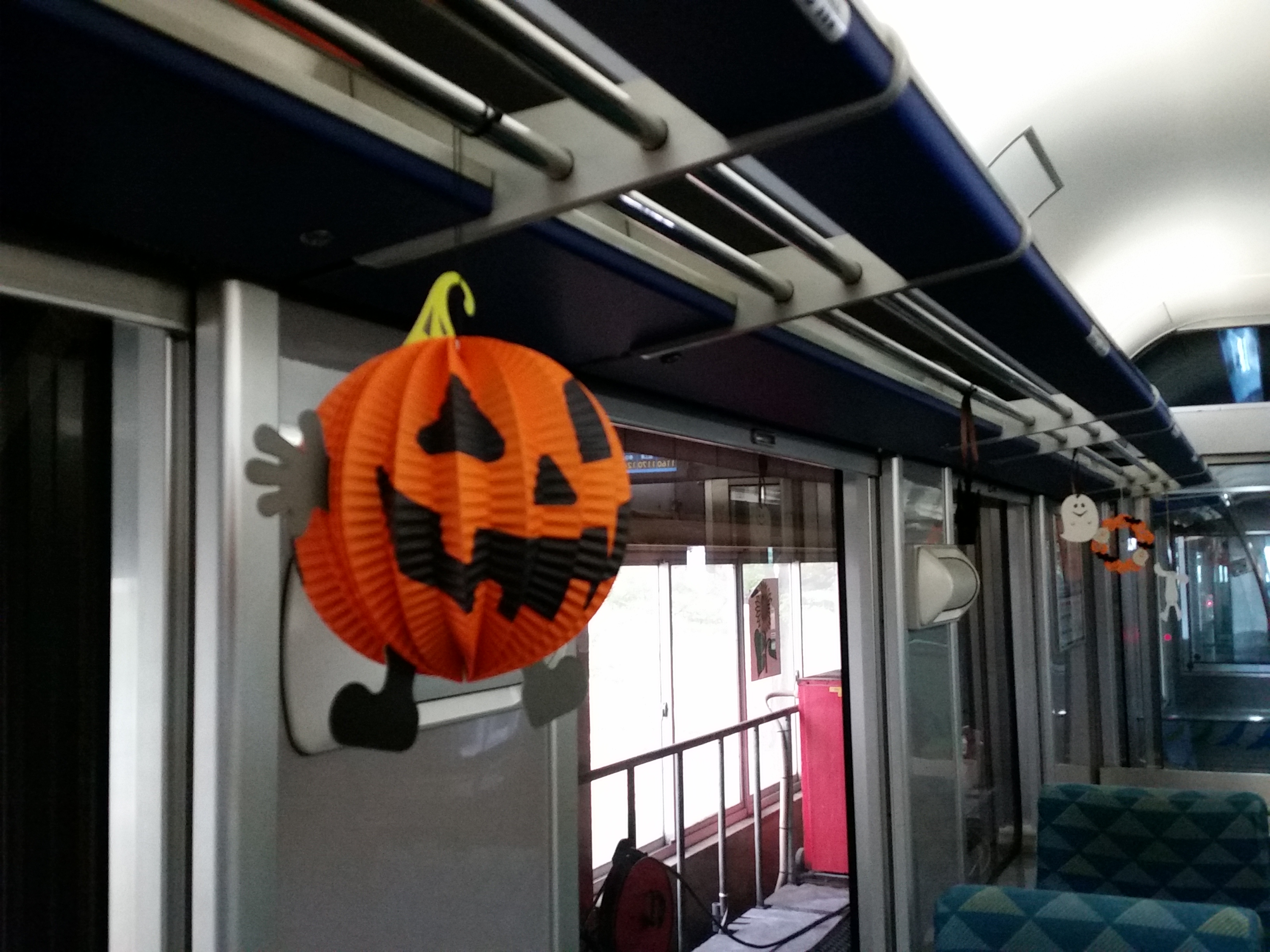 10月31日までラッピング列車DAICHIの車内にハロウィンの装飾をした