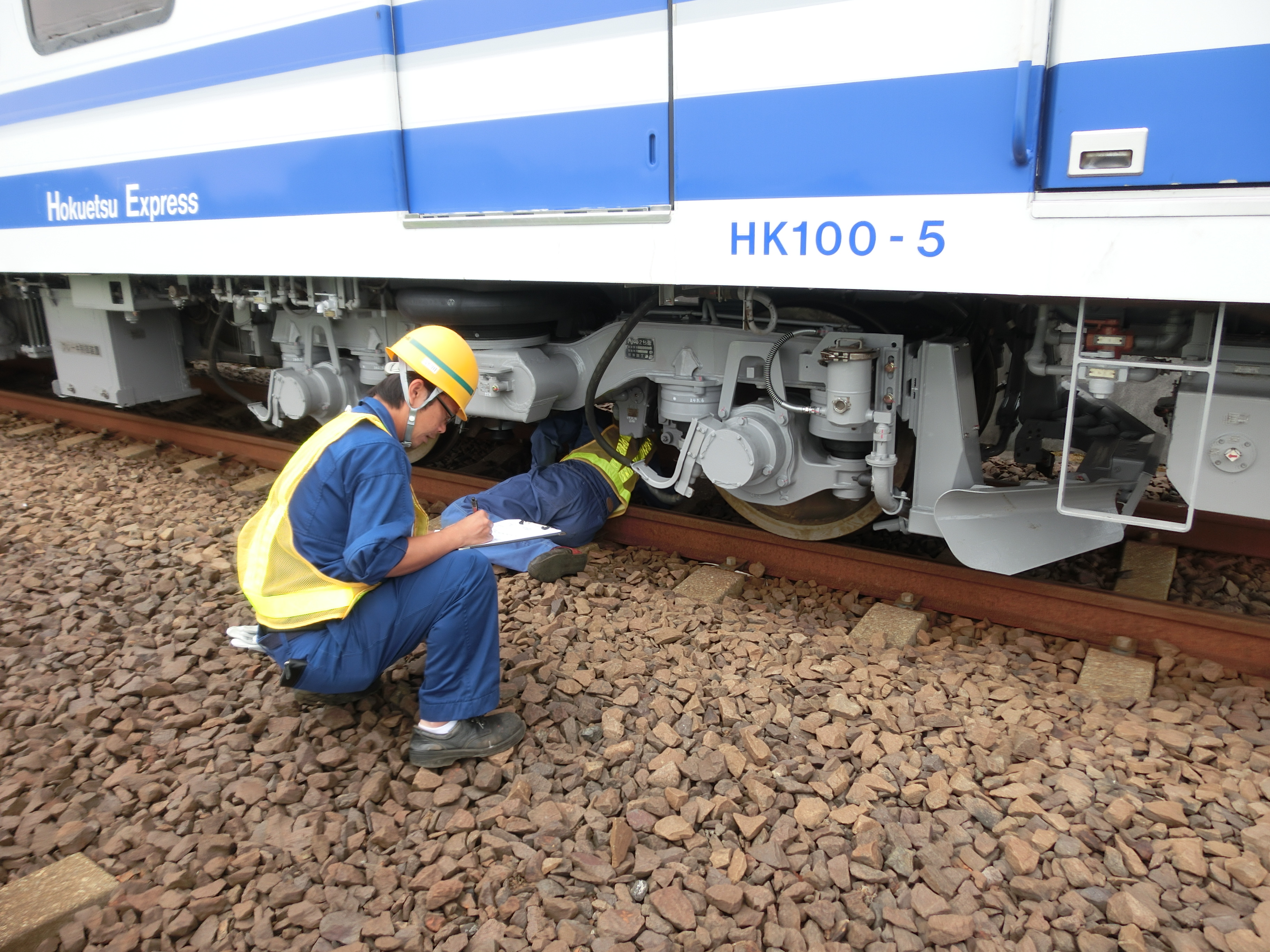 折り返し駅では、床下機器の状況を確認します。走行試験終了後、屋根廻り、床下機器に異常がないことを確認して、全般検査が終了となります。