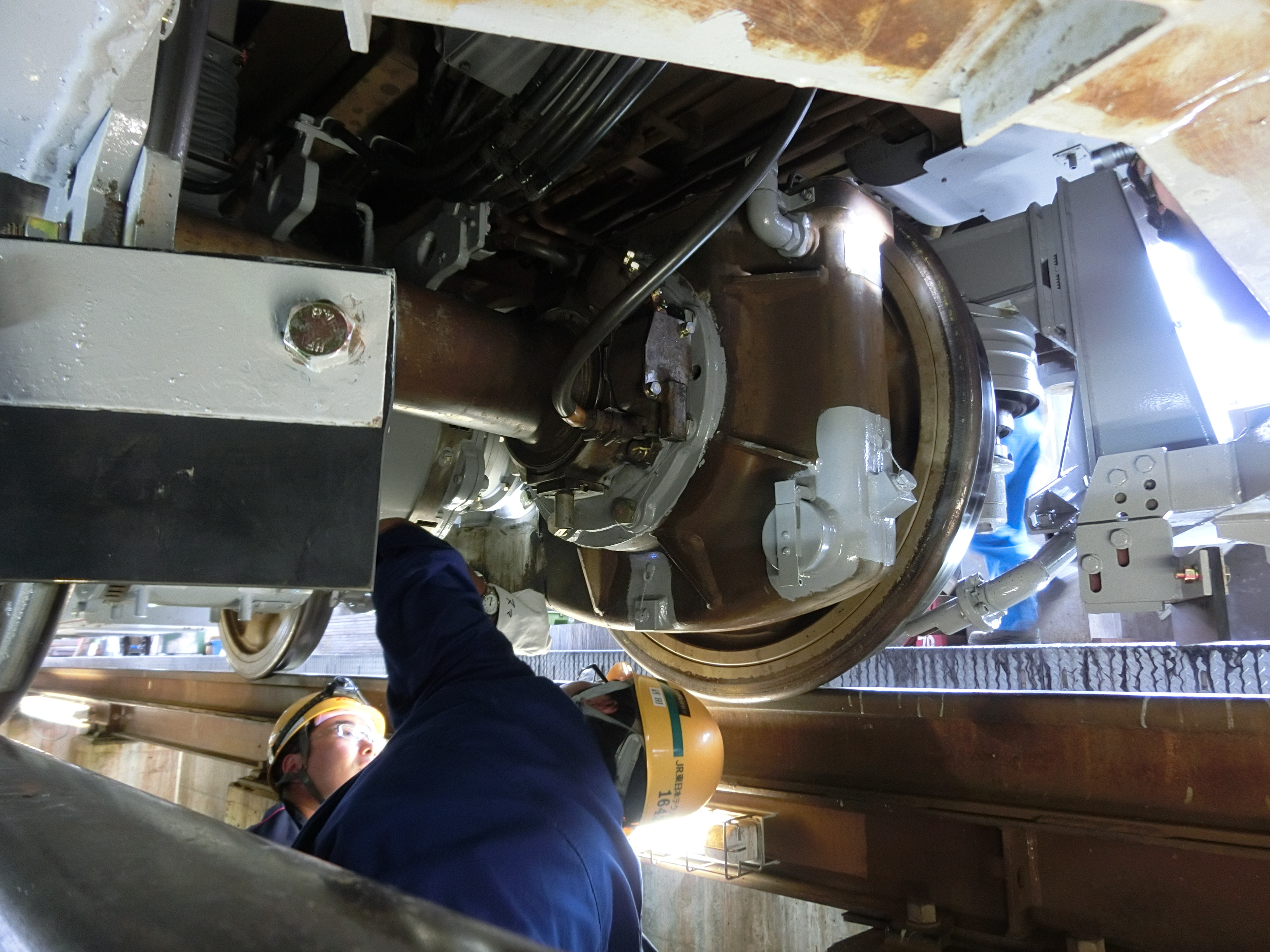 5号車には、車輪が空回りして滑ってしまうのを抑える為の砂マキ装置がついています。「砂」と言っても、本物の砂をまいているわけではなく、増粘着剤(金属の粉)を使用しています。写真は、この装置を取り付けているところです。