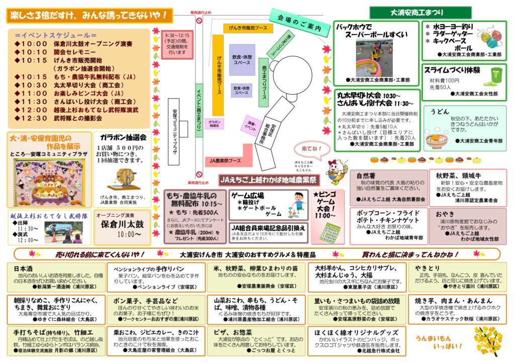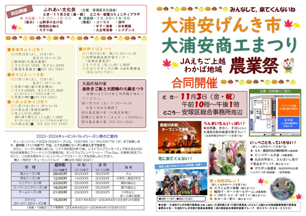 大浦安げんき市 投稿日時: 2023年10月26日 投稿者: ensen 11月3日(金・祝)安塚区総合事務所周辺で開催される『大浦安げんき市』でほくほく線オリジナルグッズを販売します 会場では2024年ほくほく線カレンダーや人気の鉄道缶、ピンバッジ、ボックスロゴTシャツなど他にも多数のオリジナルグッズを販売します! ぜひ遊びに来てくださいね ~大浦安げんき市~ ■と き 11月3日(金・祝) 午前10時~午後1時 ■ところ 安塚区総合事務所周辺 大浦安商工まつり・JAえちご上越わかば地域農業祭 合同開催! ▼▽▼▽▼▽詳細はこちらをCHECK!▼▽▼▽▼▽